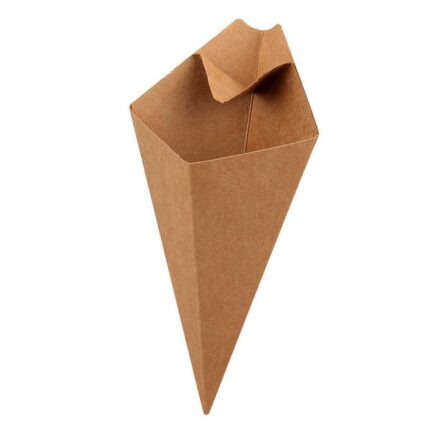 The Kraftouch French Fries Cone brings a fun, European-style aesthetic to your street food presentation. Designed with a pointed base and a wide, open top, these cones are perfect for serving generous portions of fries, churros, or popcorn shrimp. Crafted from thick, food-grade kraft paperboard, they feature a high-performance grease-resistant coating that prevents oil from soaking through, keeping the exterior clean and sturdy. Their unique shape makes them easy to hold while walking and allows them to fit perfectly into standard wire cone displays for a professional tabletop or counter-top look.